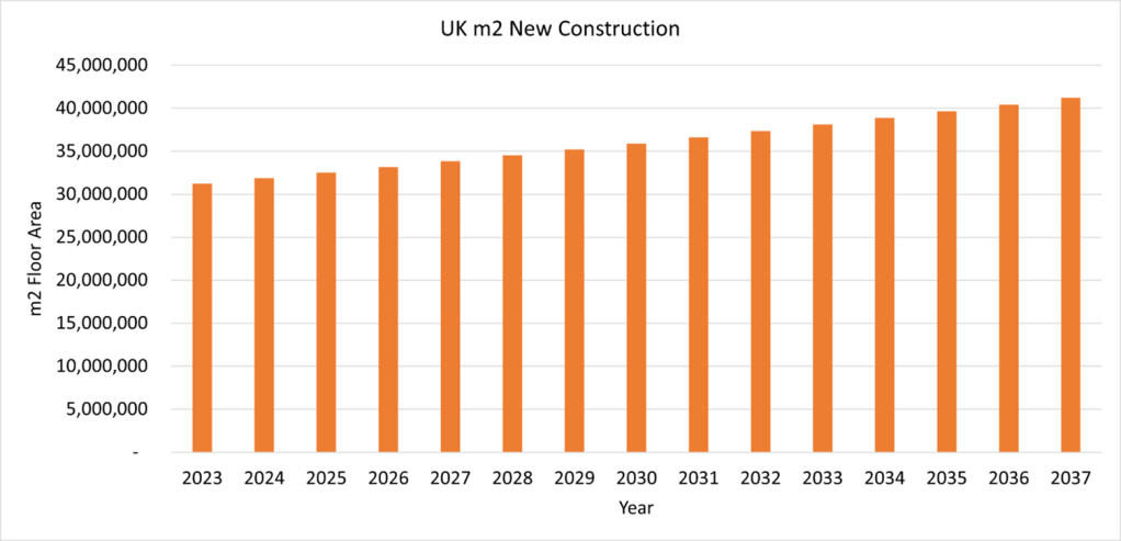To convert this national upfront embodied carbon budget into a more understandable and applicable metric, we need to estimate the floor area of new buildings each year, in m2. This is possible by using ONS data for new construction value, and an average cost of new construction (£2,540/m2). We can also reasonably assume that construction volume will increase by a few percent each year.