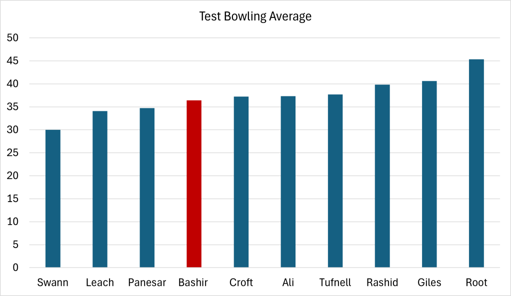After his successful return against Zimbabwe to kick off the 2025 summer, Bashir’s test match bowling average (runs per wicket) is 36.39. This places him in respectable company alongside Robert Croft, Moeen Ali, and Phil Tufnell. The unlucky Jack Leach still does notably better, averaging 34 across twice as many matches. It’s easy to see why he gets the nod for Somerset. Prior to the Zimbabwe test, Bashir would have come in third from bottom.