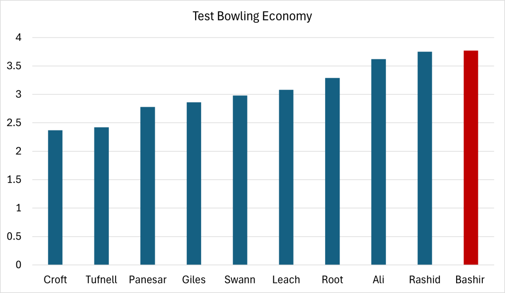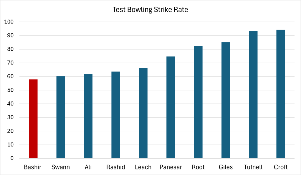 Another relevant metric is a bowler’s strike rate, balls delivered per wicket taken. Bashir comes out on top, beating even Graeme Swann.